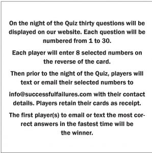 Then prior to the night of the Quiz, players will text or email their selected numbers to [email protected] with their contact details. Players retain their cards as receipt.